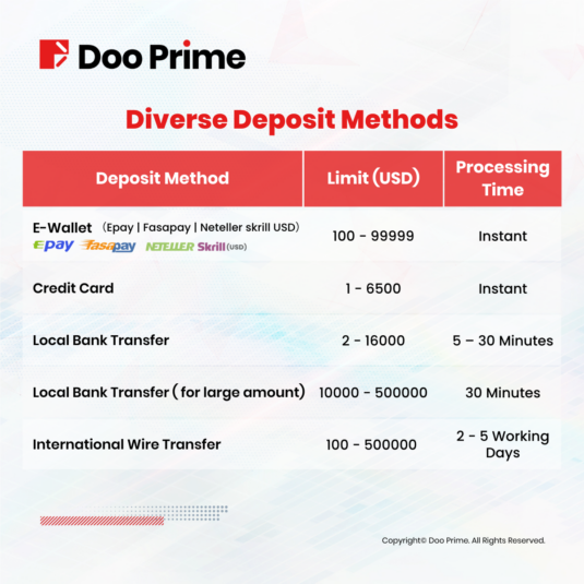 Doo Prime is also proud to partner with banks and payment service providers in Southeast Asia, providing clients with even more convenient deposit options. And, to make clients’ experience even smoother, Doo Prime even covers any fees incurred through these local bank transfers. With Doo Prime, clients can deposit funds with confidence, knowing that all transactions are secure, and funds are easily accessible.
