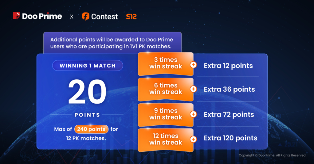 The PK tournament is made up of 12 phases with opponents assigned to every individual phase. Players can earn points by accumulating wins or winning streaks to score. At the end of the 12 phases, they can use the total points won to split the prize pool. Additional points are also rewarded when a Diamond Sponsor account is used to participate. With the support of Doo Prime, participants will be able to take on all kinds of trading environments to win the “Grand Slam” of the 12 PK tournament to win.
