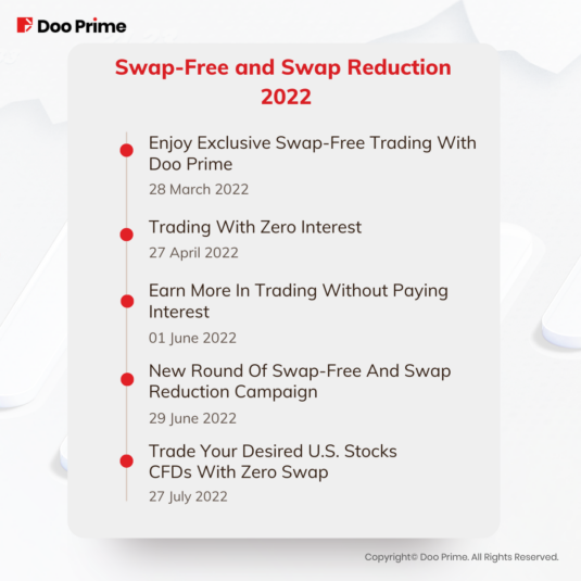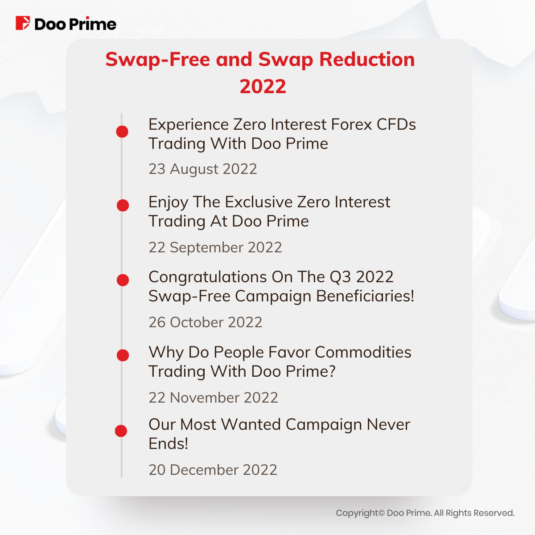 Doo Prime has introduced multiple campaigns and events in response to these arising trading opportunities. One of the most popular campaigns that have benefited our clients in multiple ways would be the “Swap Free and Swap Reduction Campaign”. This is an event that allows clients to trade certain types of products with lowered swap and some without any swap at all!