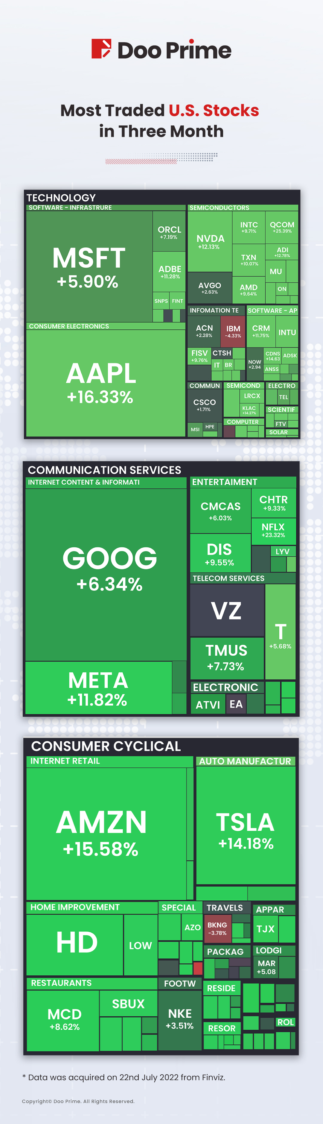 The figure above is the financial visualization that shows most traded U.S. stocks CFDs within the latest 3-month. Data was acquired on 22nd July 2022 from Finviz.
