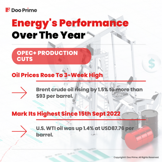 Upon the news, the oil prices rose to a three-week high, with Brent crude oil rising by 1.5% to more than $93 per barrel, adding to gains this week ahead of the gathering of oil ministers. Meanwhile, the U.S. WTI oil was up 1.4% at USD87.76 per barrel, marking its highest since 15th September 2022.