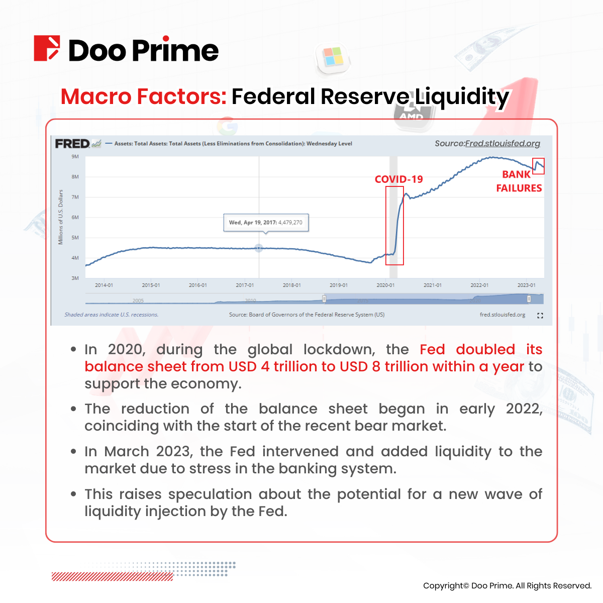 In 2020, during the global lockdown, the Fed’s balance sheet doubled from USD 4 trillion to USD 8 trillion within a year to support the economy. Although they began reducing the balance sheet at the start of 2022, it coincided with the unfolding of the recent bear market.