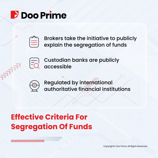 Case study 1: Doo Prime publicly states on its official website that it segregates client funds from the company’s operating funds in a cooperative bank. Meaning client assets are held and kept in custody, separated from the brokerage firm’s own funds, and assets are regularly accounted for, confirmed, and reconciled. Doo Prime is also subject to a strict audit system of international banks, where client funds are earmarked and protected at all times.