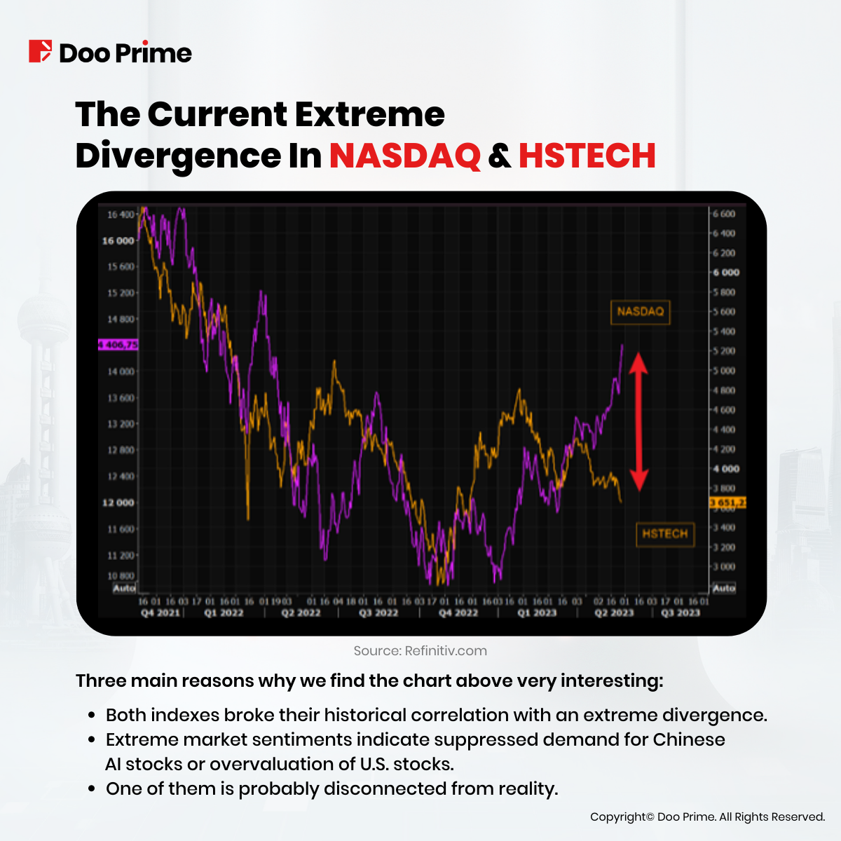 Since the beginning of 2023, AI stocks in the U.S. have been rallying over 30%, pushing the NASDAQ Index to new yearly highs, ending the 2022 bear market. While on the other hand, the HSTECH Index, which tracks Chinese tech stocks, has been heading in the complete opposite direction.