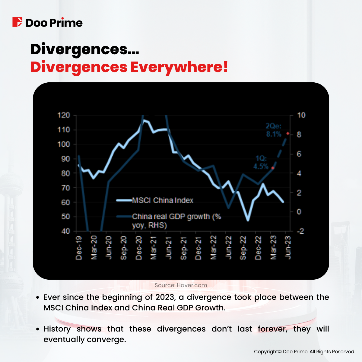 • Ever since the beginning of 2023, a divergence took place between the MSCI China Index and China’s Real GDP Growth.