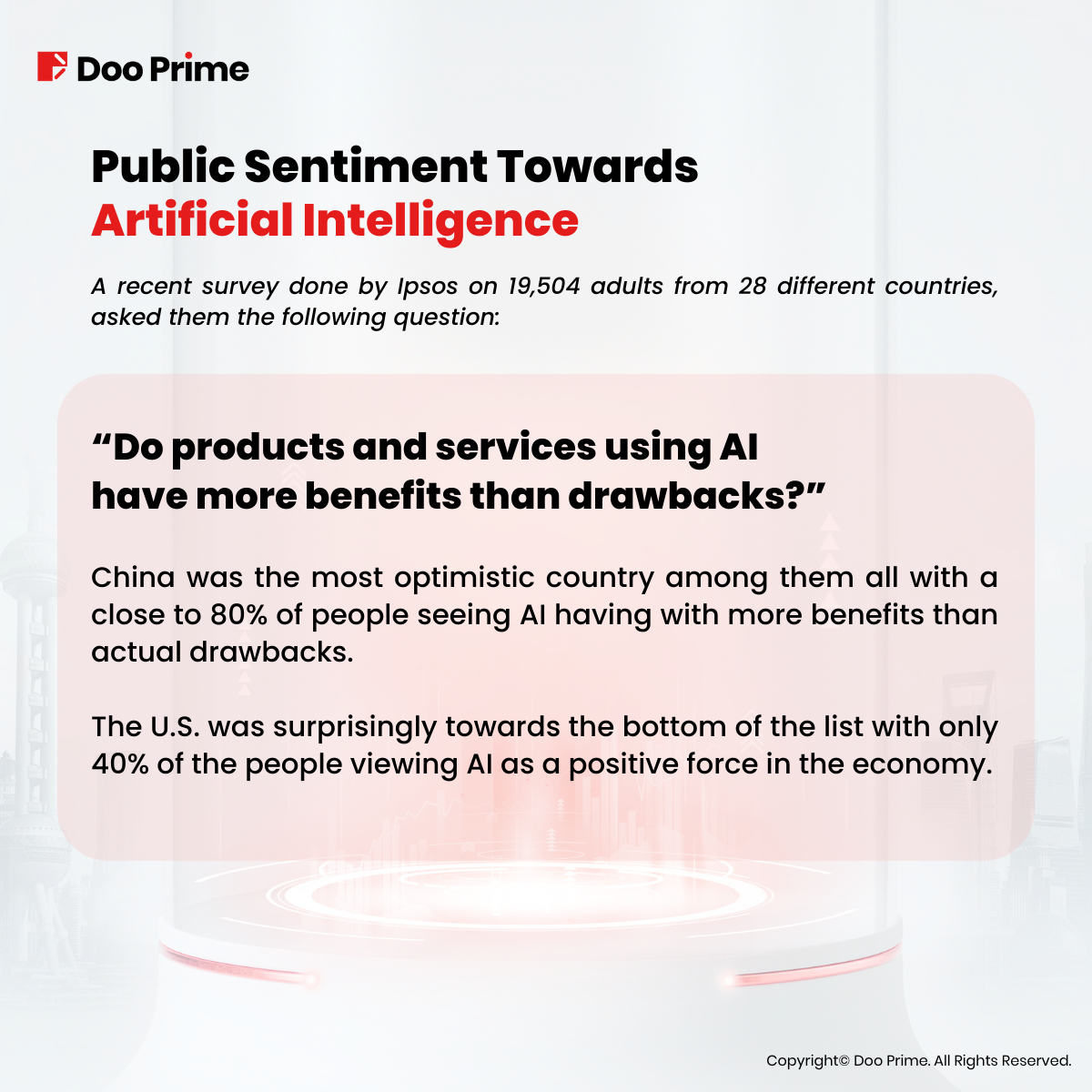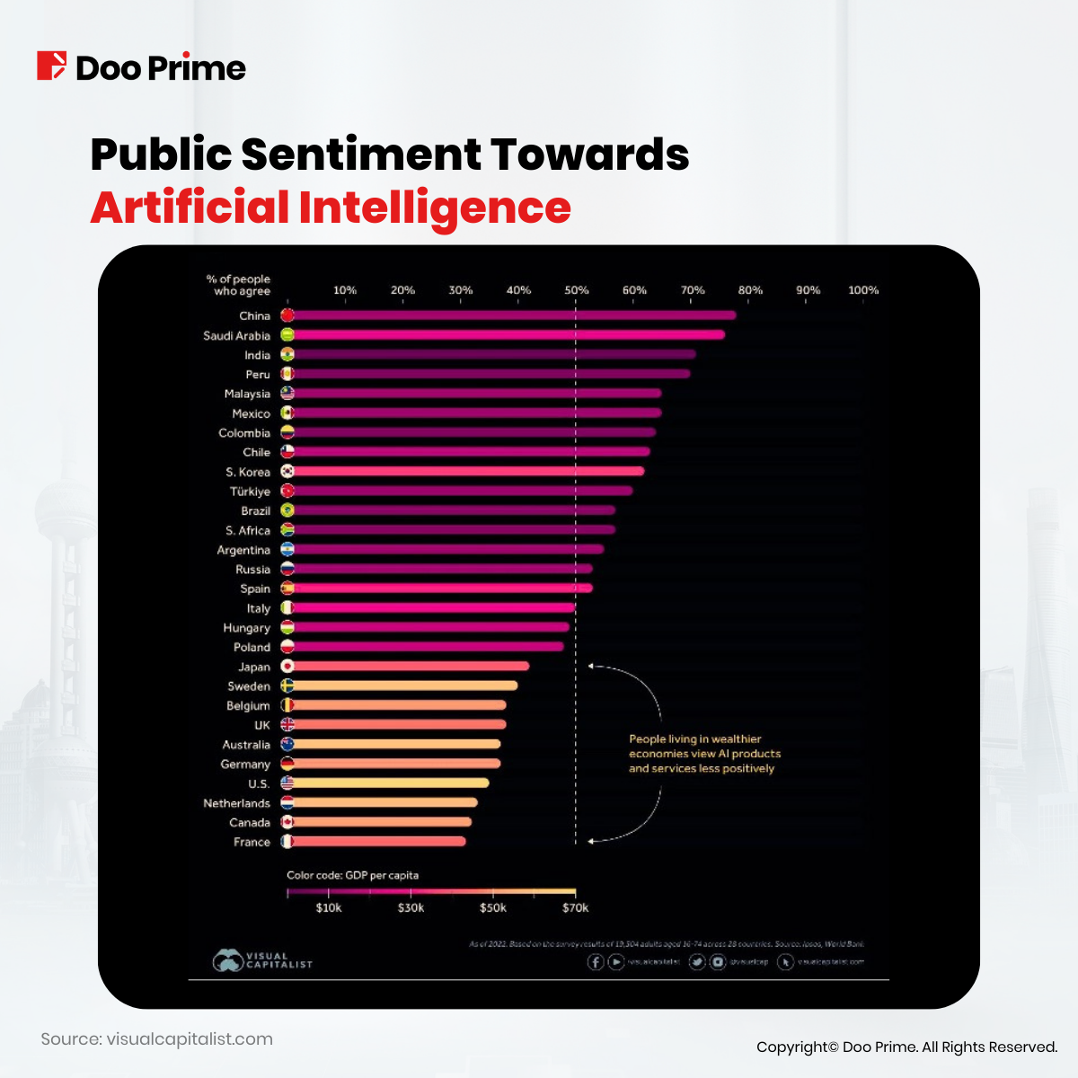China was the most optimistic country among them all with a close to 80% of people seeing AI having with more benefits than actual drawbacks.