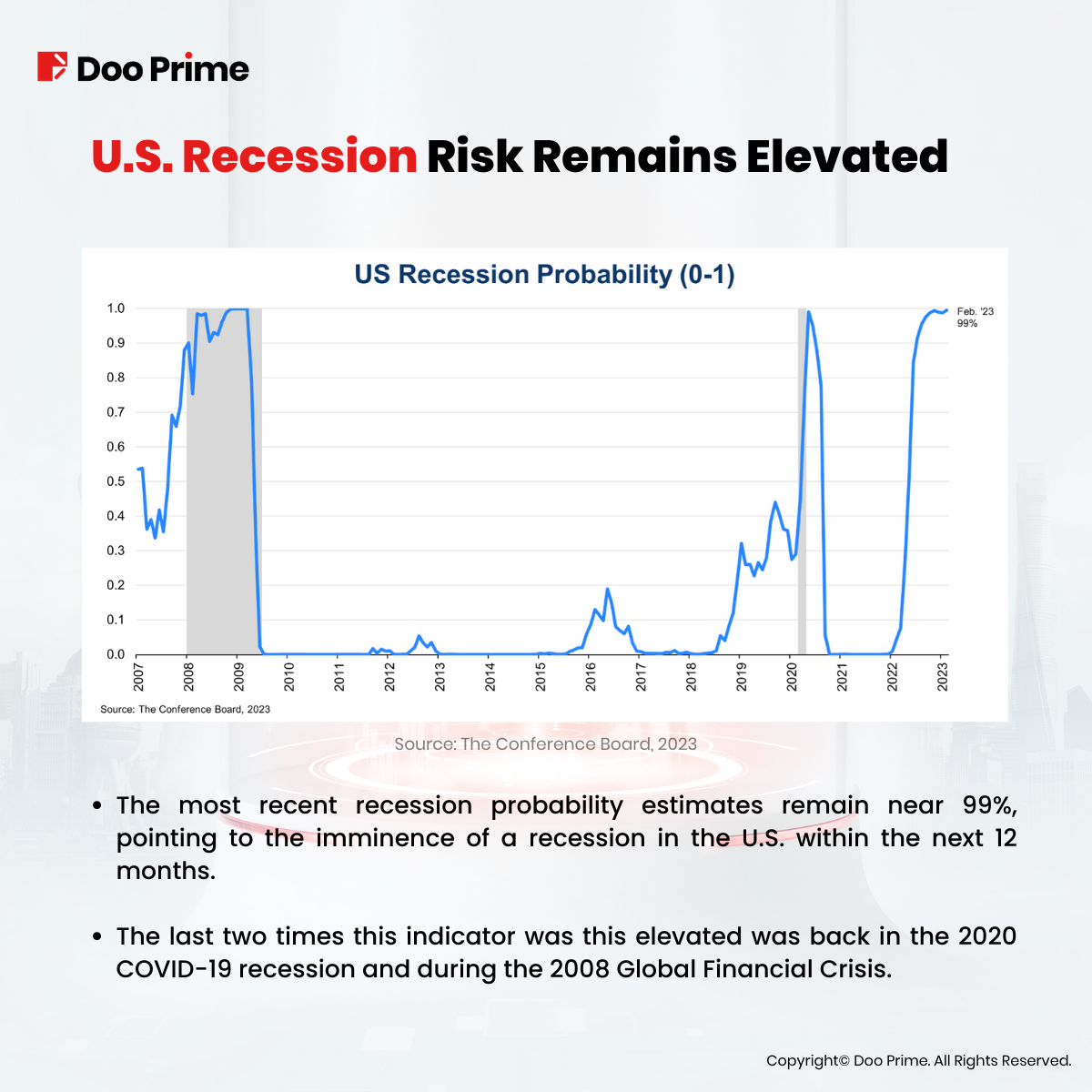 • The most recent recession probability estimates remain near 99%, pointing to the imminence of a recession in the U.S. within the next 12 months.