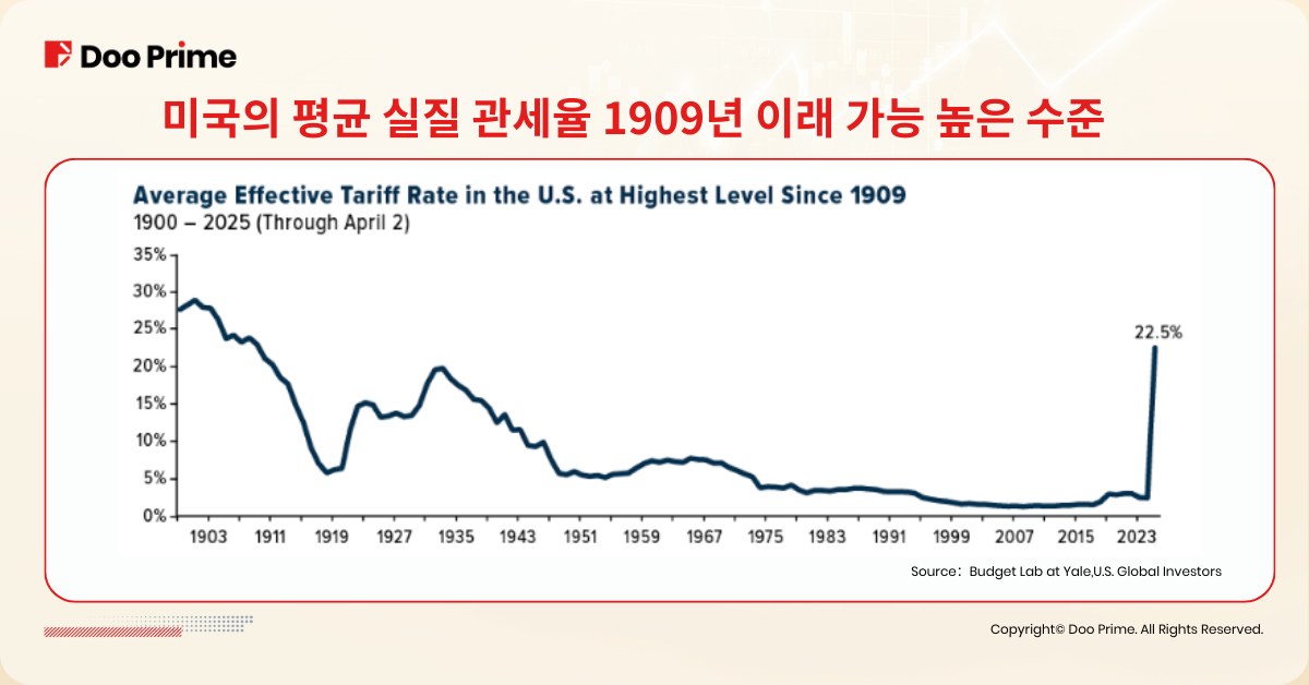 예일대학교 실험실의 추산에 따르면, 4월 2일 기준 미국의 평균 실질 관세율은 22.5%로, 이는 1909년 이후 가장 높은 수준입니다.