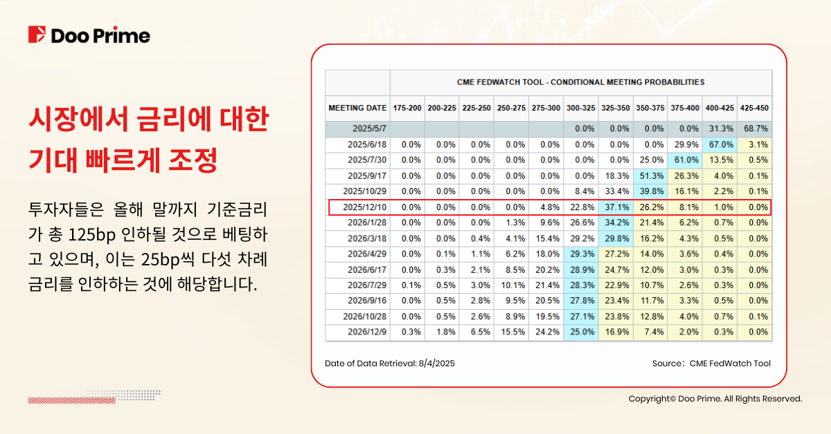 투자자들이 연준의 금리 인하에 베팅하고 있다는 사실은 글로벌 시장의 불안 심리를 반영하며. 트럼프가 대부분의 국가에 대한 대등 관세의 시행을 유예하자 트레이더들은 올해 미 연준의 금리 인하 가능성에 대한 기대치를 하향 조정했습니다. 하지만 금리에 대한 시장 기대는 언제든지 급변할 수 있으므로, 이는 투자자들이 반드시 실시간으로 주의 깊게 살펴봐야 할 핵심 요소입니다.