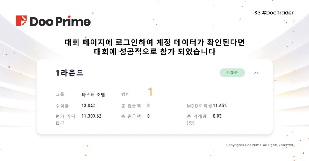 로그인 후 새로운 계좌를 개설하거나 기존에 개설한 계좌의 우측 상단 “신청하기”를 클릭하여 참여 조별을 선택하고 “지금신청”을 클릭하면 대회 신청이 완료되며 계좌 우측 상단에 “#DooTrader” 표시를 확인하실 수 있습니다.