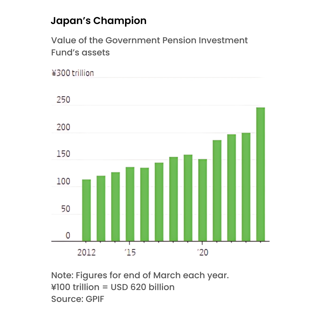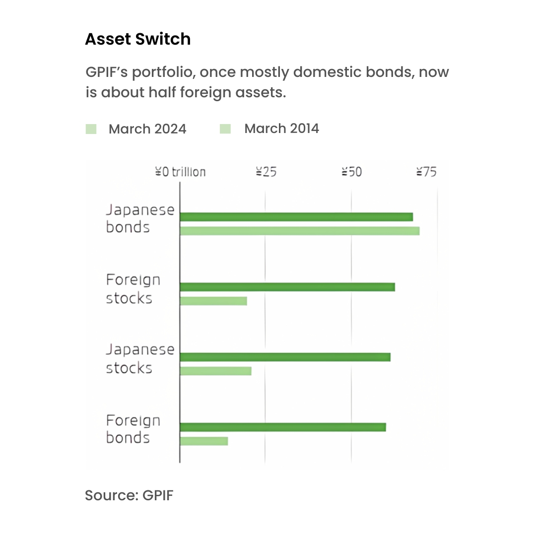 The Government Pension Investment Fund significantly increased its foreign holdings from 23% to 40% in 2014, and further to 50% a few years later. This strategy not only boosted U.S. and Japanese stocks but also encouraged similar investments by other large Japanese institutions.