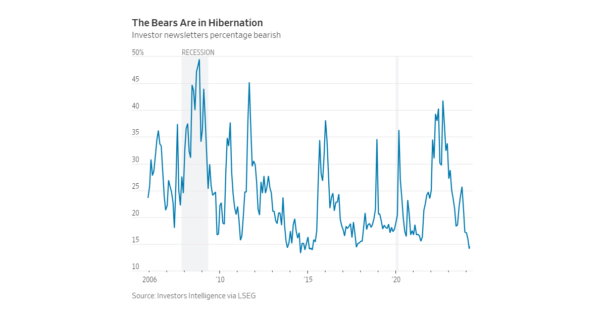 Evidence of extreme market movements, such as in Trump Media & Technology and smaller AI firms, along with heightened investor confidence, suggests pockets of excess. Surveys revealing bullish sentiment among investors further contribute to the cautious outlook, as euphoria levels approach levels reminiscent of previous market downturns.
