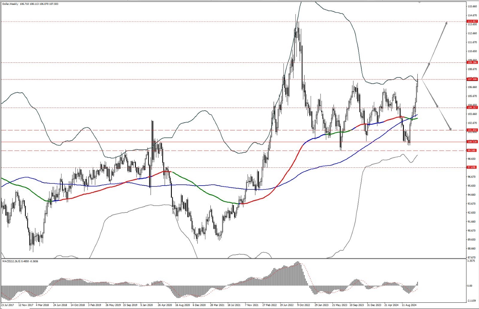 - 如果美指在 107.50 一线附近承压回落,则依次关注 104.35 和 101.85 两个位置的支撑力度。