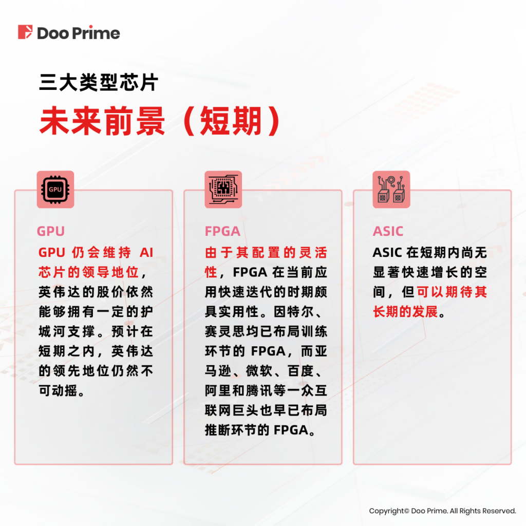 长期来看,无论是 GPU、FPGA 或是 ASIC,这三种技术路线均各有千秋。GPU 的未来无疑会向着更强大、更复杂的算力方向发展。而 FPGA 凭借灵活性的优势,对于应对变化迅速的行业十分适用。而 ASIC 在当前阶段运用较少,却在未来长远来看会十分适用于人工智能行业。因为 ASIC 具备高性能低能耗的特点,可以基于多个人工智能算法展开定制,从而针对不同环境达到最佳的适应性。随着未来进一步发展,ASIC 有望在训练和推理阶段皆能占据一定市场地位。