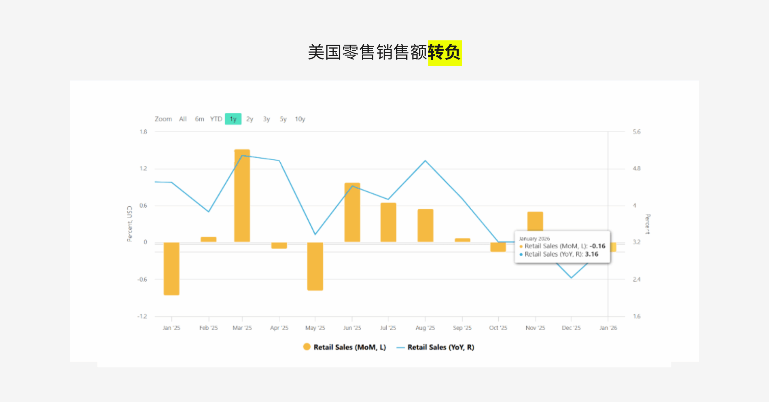 需求方面,1 月零售销售环比降至 -0.16%,但略好于市场预期的 -0.3%,其中餐饮和汽车销售是主要拖累,可能与寒冷天气有关。即便没有冲突,美国消费前景也较为承压:一方面,关税、通胀与就业疲软抑制消费;另一方面,《大美丽法案》承诺的退税预计将在下季度加速发放。综合来看,消费可能不会成为经济的显著拖累项。