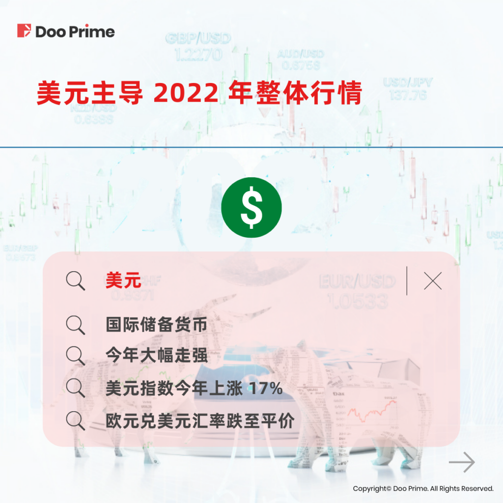 作为国际储备货币,美元今年的火热行情有目共睹。随着美联储为了抑制通胀而大举加息,美元纷纷回流,推动美元兑其他国家货币的汇率随之上涨,造成美元大幅走强。今年迄今,美元指数 ( DXY ) 已大涨逾 17%。美元兑其他各国主要货币的汇率行情亦在今年接连走高。