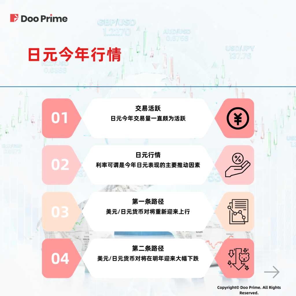 利率可谓是今年日元表现的主要推动因素。按照当前情形推演,我们预计日元行情或将在明年出现两种不同的路径。