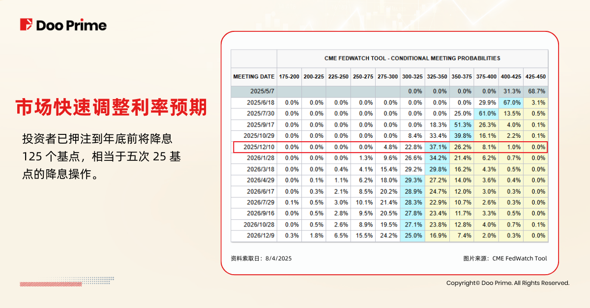 随着美国政府加征关税引发全球经济衰退的担忧,市场对降息次数的预期也快速调整,从原先的 2 次上调至多达 5 次。在 4 月 8 日,投资者押注到年底前将降息 125 个基点,相当于五次 25 基点的降息操作。