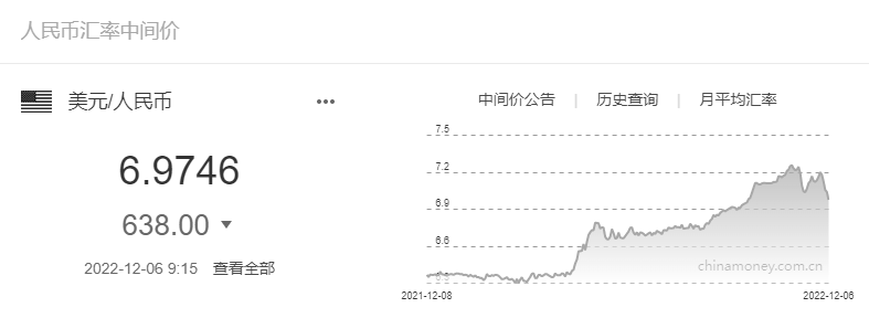 12 月 6 日,在岸、离岸人民币兑美元延续强劲反弹势头,昨日更创下 9 月份来新高。人民币兑美元汇率中间价报 6.9746,调升 638 个基点。早盘,离岸人民币兑美元强势升破 6.95 关口,日内涨超 220 点,最高报 6.9473。
