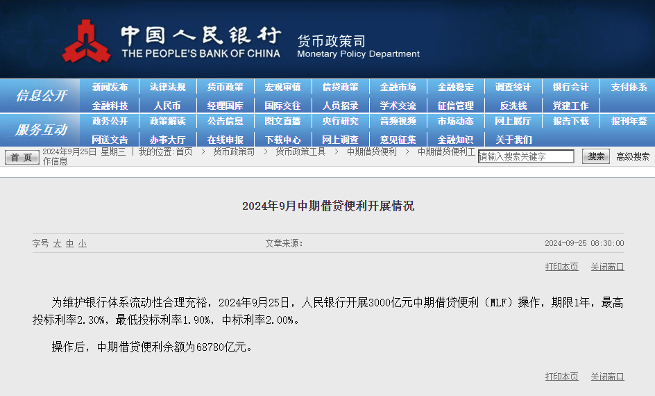 前一日,中国人民银行行长潘功胜在国新办发布会上,预告政策利率调整之后,将会带动中期借贷便利(MLF)利率下调大概在 0.3 个百分点,预期贷款市场报价利率(LPR)、存款利率等也将随之下行 0.2-0.25 个百分点。