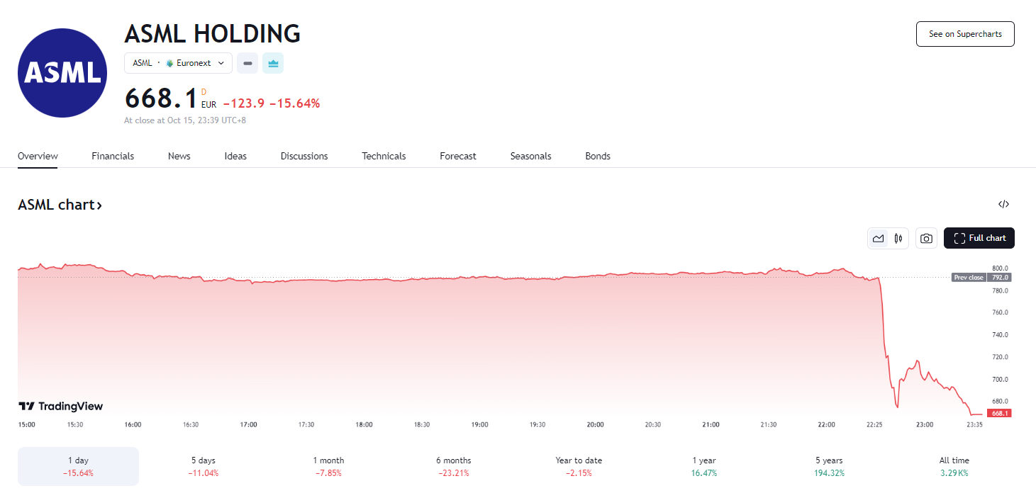 阿斯麦财报后跌近 16%,拖累芯片股、美股大盘下挫