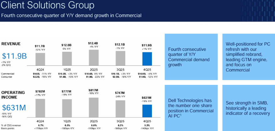 27 日,戴尔科技(DELL)发布的第四季度财报显示,营收年增 7.2%至 239.3 亿美元,低于市场预期的 245.5 亿美元,调整后每股收益(EPS)为 2.68 美元,超出市场预期的 2.51 美元。客户解决方案集团(CSG)的营收增长 1.4%至 118.8 亿美元,其中商用PC营收增长 5%至 100 亿美元,但消费型 PC 营收则下滑 12%,降至 19 亿美元。