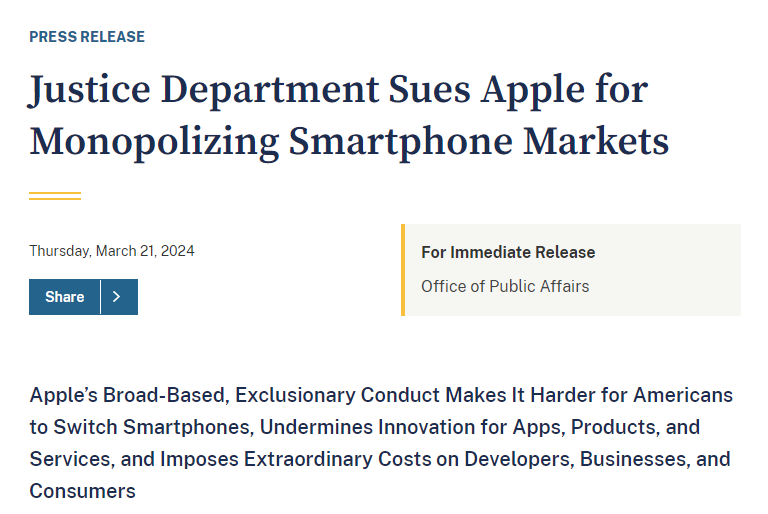 21 日,美国司法部联合 16 个州的最高执法长官,共同起诉苹果违反反垄断法,认为苹果利用在手机市场的垄断地位危害消费者、开发者和竞争对手公司,以牺牲这些消费者、开发者和对手获得“天文数字一般的估值”。
