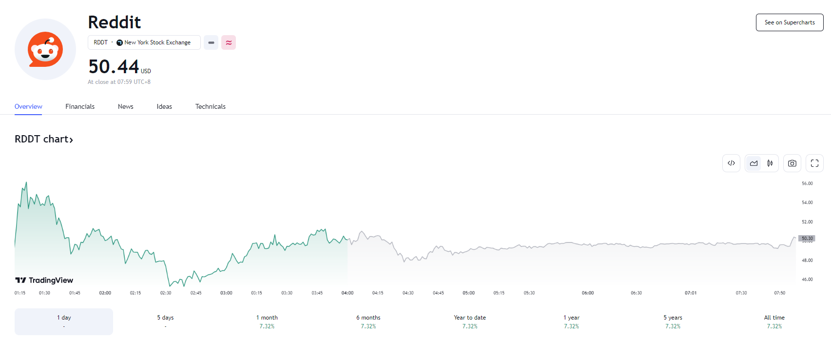 Reddit 开盘后股价一路狂飙,盘中最高价触及 57.8 美元,涨幅高达 70%。按最高价计算,最高市值达 109 亿美元。开盘后半小时左右,Reddit 股价回落到 48.64 美元,市值降为约 79 亿美元,最终收涨 48%,收盘价为 50.44 美元,市值约为 95 亿美元。