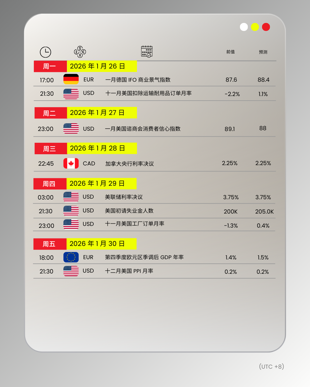 财经日历 | 以下为 2026 年 1 月 26 日至 2026 年 1 月 30 日(GMT+8 北京时间) 全球重大经济事件提醒。在重大行情期间,请确保您已审查您的保证金率,并有足够的保证金来支撑您的风险敞口。