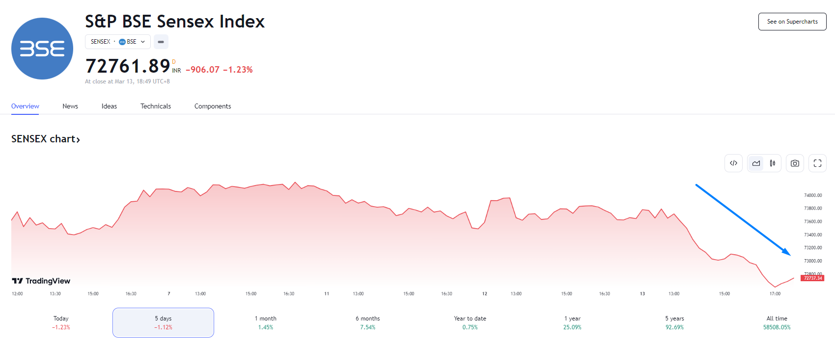印度 Sense 指数重挫 906 点,跌破 73000 关口,Nifty 指数也跌破 22000 关口。孟买证券交易所股票的市值减少 14 万亿卢比,降至 372 万亿卢比。