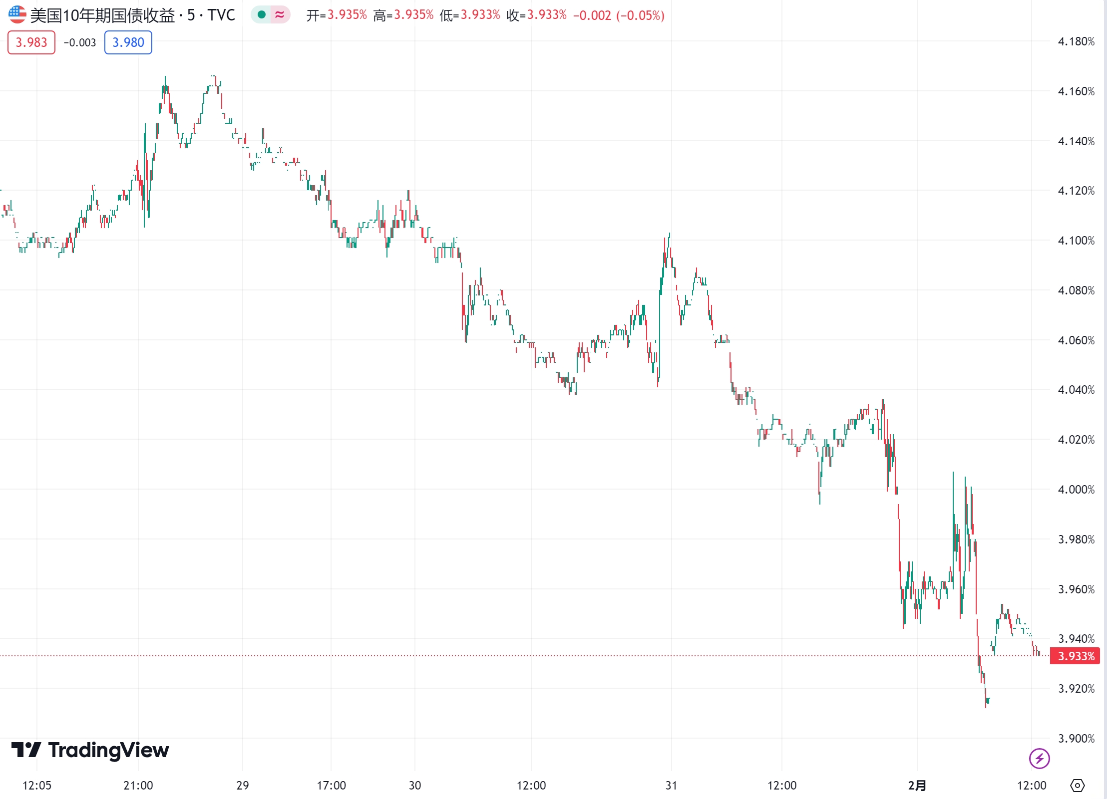 而在美联储决议发布尤其是鲍威尔讲话后,各期限美债收益率其实还是收窄了部分日内的跌幅。截止纽约时段尾盘,2 年期美债收益率下跌 12.4 个基点报 4.221%,5 年期美债收益率跌 13.3 个基点报 3.841%,10 年期美债收益率跌 12 个基点报 3.917%,30 年期美债收益率跌 8.2 个基点报 4.171%。