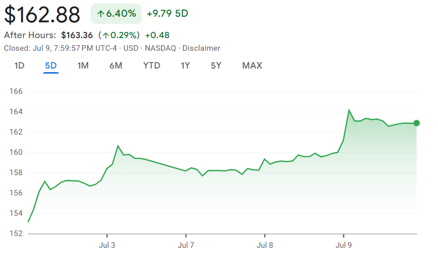 7 月 10 日,英伟达股价创新高,盘中最高达到 164.42 美元,涨幅一度达到 2.7%,市值首次突破 4 万亿美元大关,成为历史上首家达到这一市值的企业。收盘时股价上涨 1.8%,市值回落至约 3.97 万亿美元。