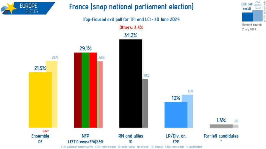 6 月 30 日,益普索(Ipsos)、Ifop、OpinionWay 和 Elabe 的出口民调显示,玛丽娜·勒庞(Le Pan)领导的极右翼政党国民联盟(RN)凭借 34.2% 的支持率击败了马克龙(Emmanuel Macron)领导的中间派联盟“在一起”(Ensemble),后者取得 21.5% 的支持率,位列第三;新左派联盟“新人民阵线”(NPF)则以 29.1% 的得票率位居第二。勒庞在法国议会选举中取得了历史性的成就,赢得了第一轮选举,但最终结果将取决于下周第二轮选举前的政治交易。