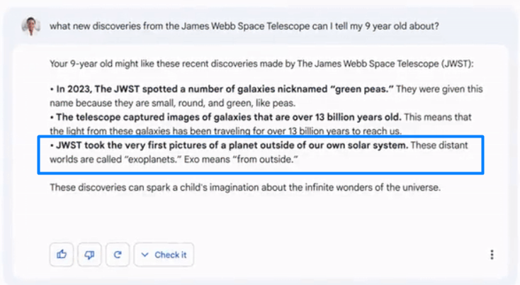 相关提问是 “关于詹姆斯·韦伯太空望远镜( JWST ),我可以告诉我 9 岁的孩子它有哪些新发现?” Bard 针对提问给出了一些答案,如篮框所示,其中一个是 “太阳系外行星的第一张照片是用 JWST 拍摄的”,但根据美国国家航空航天局( NASA ),第一张系外行星照片是由欧洲南方天文台的甚大望远镜( VLT )在 2004 年时拍摄的。Bard 提供错误资讯,这加剧了人们对相关工具尚未准备好集成到搜索引擎中的担忧。