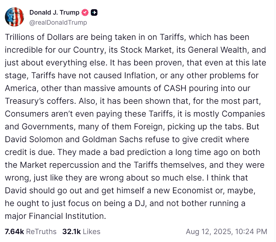 当地时间周二,特朗普在社交媒体发文,批评高盛对关税政策的市场影响和消费者成本做出 “错误预测”,并点名嘲讽 CEO David Solomon,称他不如改行专注爱好,当个 DJ 更合适。