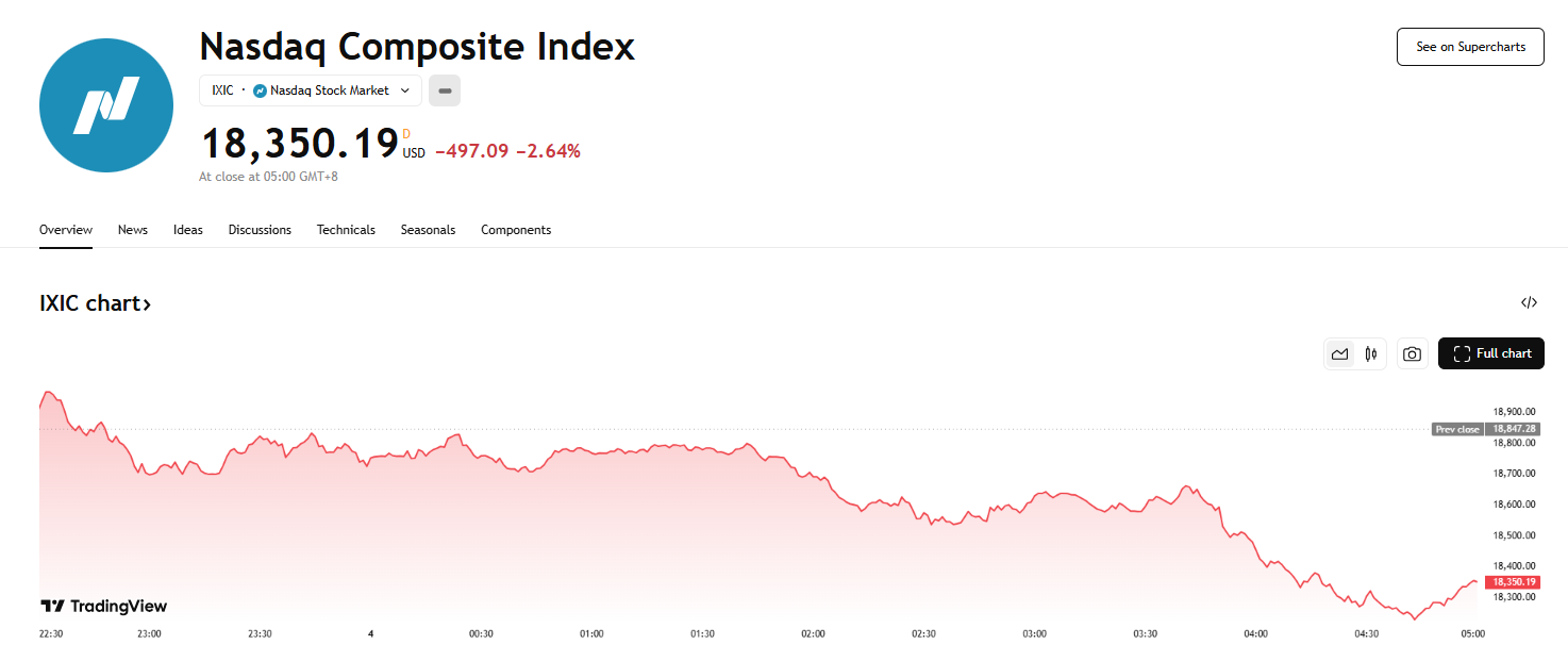 美股三大指数盘中一度跌超 2%,截至收盘,道指跌 1.48%,标普 500 指数跌 1.76%,纳斯达克跌 2.64%。