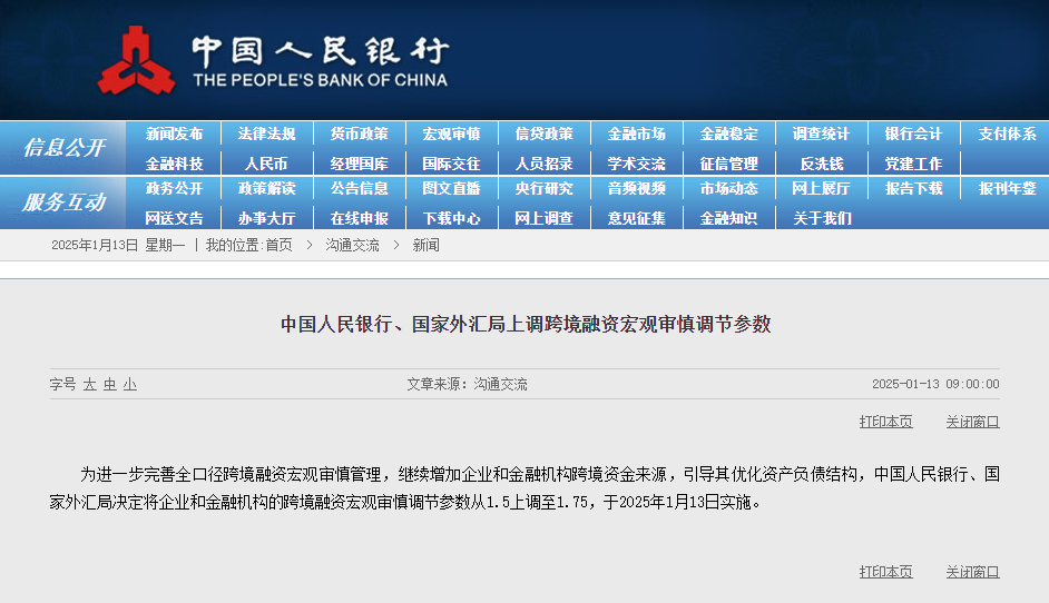 1 月 13 日,根据中国人民银行公告,为进一步完善全口径跨境融资宏观审慎管理,继续增加企业和金融机构跨境资金来源,引导其优化资产负债结构,中国人民银行、国家外汇局决定将企业和金融机构的跨境融资宏观审慎调节参数从 1.5 上调至 1.75,于 2025 年 1 月 13 日实施。