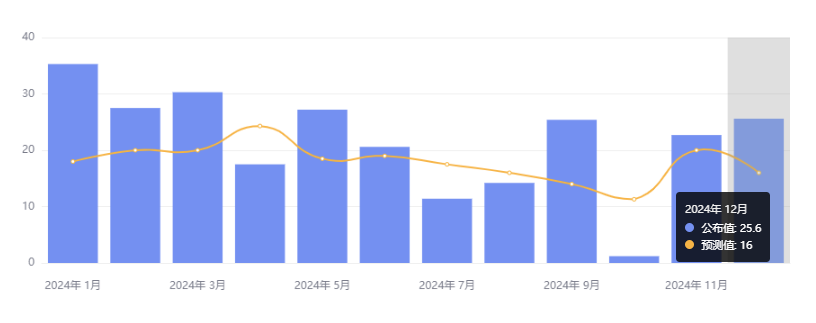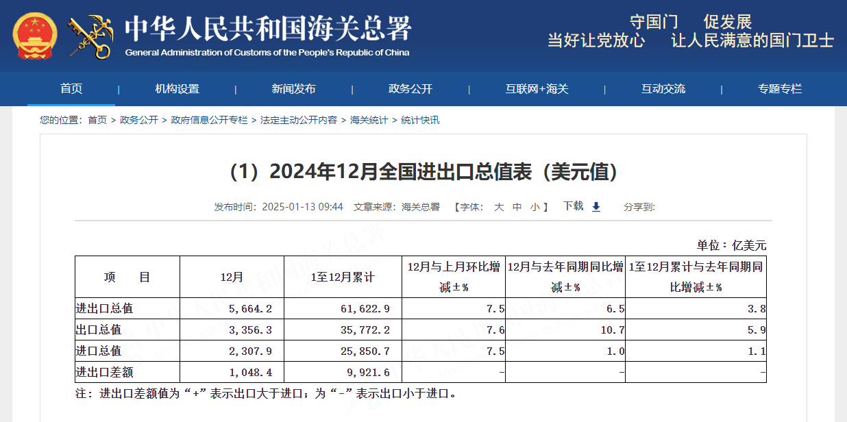 1 月 13 日,中国海关总署发布数据显示,12 月以美元计价出口同比增长 10.7%,以美元计价进口同比增长 1%。2024 年货物贸易进出口总值 43.85 万亿元,同比增长 5%;其中,出口 25.45 万亿元,同比增长 7.1%,进口 18.39 万亿元,同比增长 2.3%。