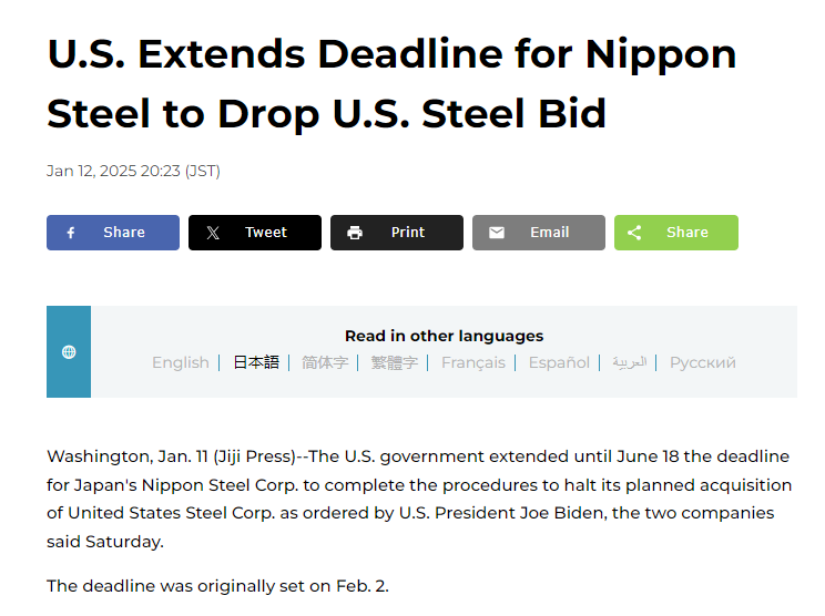 1 月 11 日,新日铁和美国钢铁在一份联合声明中表示,美国拜登政府已将新日铁放弃 149 亿美元收购美国钢铁的命令推迟到 6 月中旬。