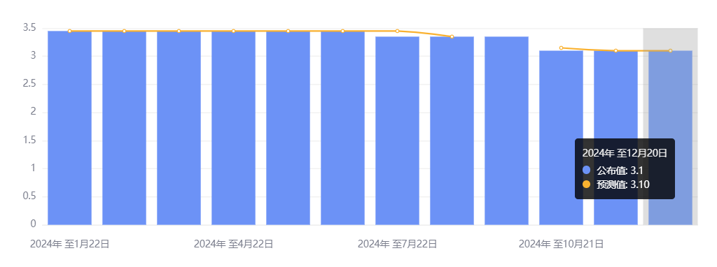 12 月 20 日,中国人民银行授权全国银行间同业拆借中心公布,2024 年 12 月 20 日贷款市场报价利率(LPR),1 年期 LPR 为 3.1%,5 年期 LPR 为 3.6%,均较前值不变,以上 LPR 在下一次发布 LPR 之前有效。