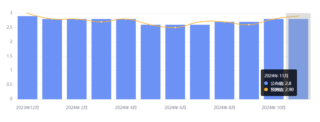 剔除波动性较大的食品和能源后,11 月核心 PCE 物价指数同比增长 2.8%,持平前值,同样低于预期的 2.9%;环比增长 0.1%,低于预期的 0.2%,创下了 5 月以来最低纪录。