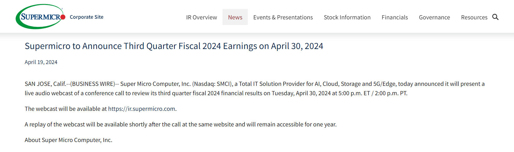 4 月 19 日,超微电脑在一份简短新闻稿中表示,将于 4 月 30 日公布第三财季业绩,然而,超微电脑打破了此前提供初步业绩的惯例,引发投资者忧虑,疯狂减持该股,导致其股价暴跌 23%,创两个多月新低。