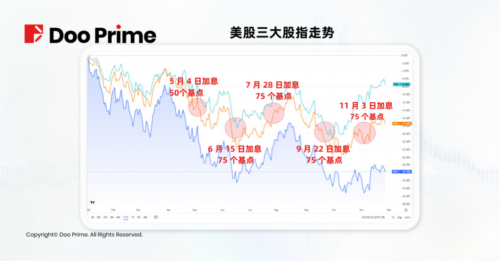 美联储开启激进加息通道后,美股便同时进入熊市下行通道。今年迄今,美股三大股指均出现大跌行情。截至撰稿时,道琼斯指数、标普 500 指数和纳斯达克指数今年已分别下跌 9.36%、20.19% 及 33.01%。