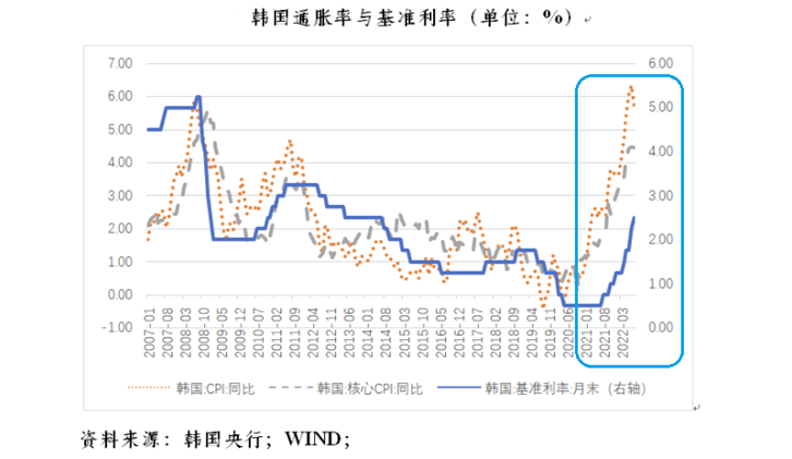韩国 CPI 通胀自去年 4 月份起持续超过 2% 的中期通胀目标,到今年 8 月份,CPI 同比增长 5.7%,核心 CPI 增长 4.4%。韩国央行去年 8 月份启动了加息周期,领先美联储。