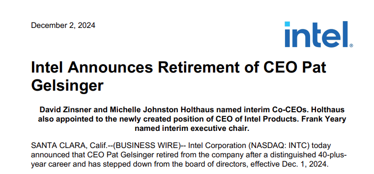 英特尔公司宣布 CEO 帕特·基辛格(Pat Gelsinger)退休,并辞去董事会职务,2024 年 12 月 1 日起生效。英特尔已任命两位高层领导 David Zinsner 和 Michelle (MJ) Johnston Holthaus 为临时联席 CEO,同时董事会正在寻找新的人选。