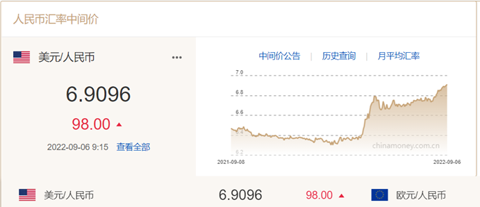 据中国货币对交易中心数据显示,截至 9 月 5 日 16:30,在岸人民币对美元收盘价报 6.9366 元,较上一交易日跌 338 个基点;离岸人民币对美元汇率当日同样走弱,盘中接连跌破 6.93、6.94 和 6.95 关口,距离“破 7 ”仅一步之遥。