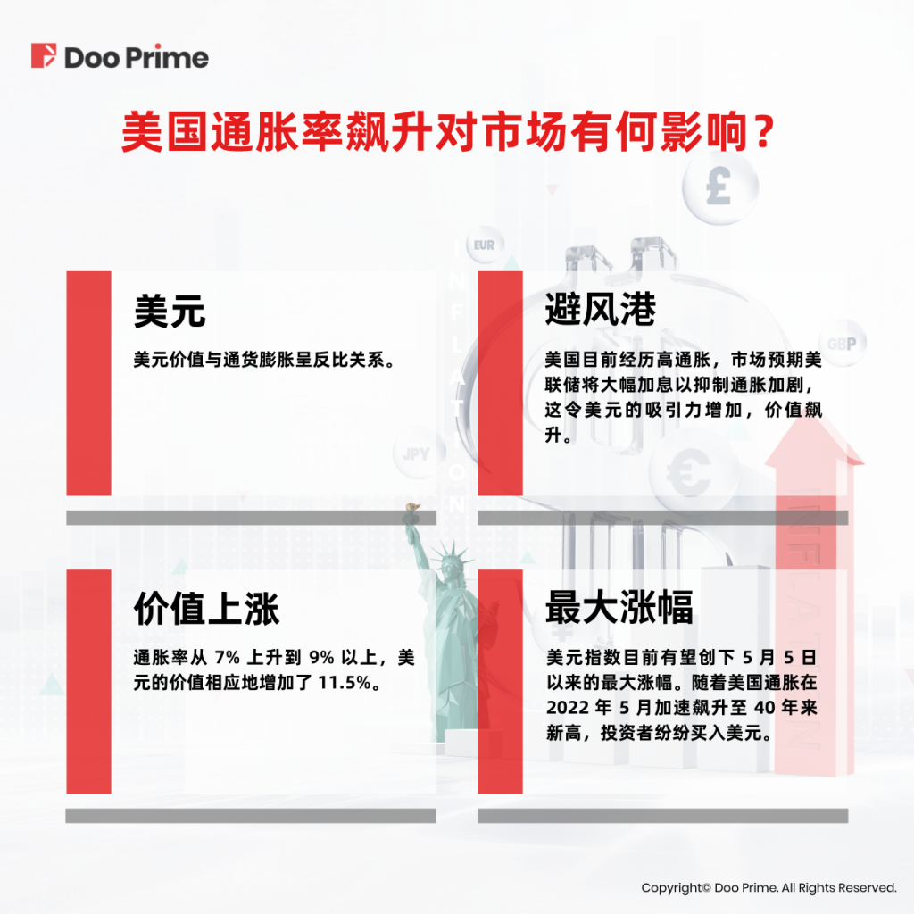 美元指数目前有望创下 5 月 5 日以来的最大涨幅。随着美国通胀在 2022 年 5 月加速飙升至 40 年来新高,投资者纷纷买入美元。