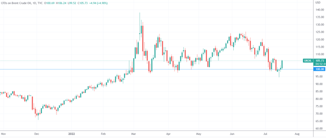据芝加哥商品交易所(CME) 经济新闻 7 月 18 日消息,在国际原油市场, WTI 原油重回 100 美元/桶,日内涨幅 2.5%;布伦特原油涨超 2.7%,报 103.7 美元/桶。
