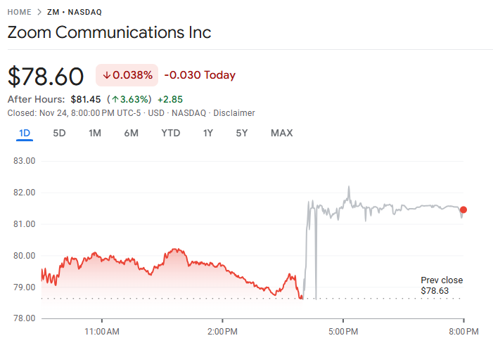 11 月 24 日至 25 日,Zoom(ZM)公布第三季度财报,营收同比增长 5.1% 至 12.3 亿美元,优于市场预期的 12.1 亿美元;每股收益(EPS)1.52 美元,高于预期的 1.44 美元。其中,企业客户业务表现稳健,营收同比增长 6.1%,达到 7.414 亿美元。