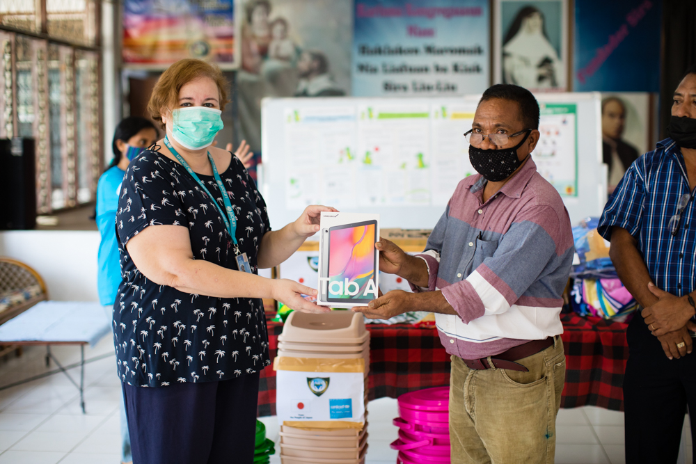 在帝力的一家儿童寄宿护理机构,联合国儿童基金会驻东帝汶代表 Valérie Taton 向社会团结与包容部移交了一批平板电脑,这些平板电脑将用于协助该部门应对新冠疫情的工作。